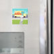 If you have a thirst for a mid century modern design, this Retro Small Town Milkman Magnet is for you! The 1960's style, minimalist art design features a dedicated, milkman making his morning rounds. The blonde man is wearing milky white pants, shirt and hat with a black bow tie, belt and shoes. This delivery man of calcium and Vitamin D is walking up a front sidewalk, carrying a family's weekly supply of wholesome, fresh milk in glass bottles. The morning newspaper is still on the sidewalk. Don't worry. Only good news is allowed in this town! The sidewalk is surrounded by the type of green lawn only found in small towns and suburbia. There is also a white, picket fence. In the street, we see the milkman's sweet ride! It's a creamy yellow, milk truck with a red stripe on the side and red lettering that says, "DAIRY". On the opposite side of the street, we see an aqua sky and the light blue silhouettes of cedar trees. This kitschy cartoon looks like a scene out of an old television sitcom. Bring on the yellow cake with chocolate frosting--the official cake of all television housewives and their fortunate families! Building strong bones never tasted so good!