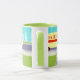 If you have a thirst for a mid century modern design, this Retro Small Town Milkman Mug is for you! The 1960's style, minimalist art design features a dedicated, milkman making his morning rounds. The blonde man is wearing milky white pants, shirt and hat with a black bow tie, belt and shoes. This delivery man of calcium and Vitamin D is walking up a front sidewalk, carrying a family's weekly supply of wholesome, fresh milk in glass bottles. The morning newspaper is still on the sidewalk. Don't worry. Only good news is allowed in this town! The sidewalk is surrounded by the type of green lawn only found in small towns and suburbia. There is also a white, picket fence. In the street, we see the milkman's sweet ride! It's a creamy yellow, milk truck with a red stripe on the side and red lettering that says, "DAIRY". On the opposite side of the street, we see an aqua sky and the light blue silhouettes of cedar trees. This kitschy cartoon looks like a scene out of an old television sitcom. Bring on the yellow cake with chocolate frosting--the official cake of all television housewives and their fortunate families! Building strong bones never tasted so good!