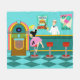 Serve up something special with this Retro Soda Fountain Fleece Blanket. The minimalist art, cartoon drawing design features the interior of the coolest spot in town. It's a 1950's soda fountain, in all of its kitschy glory! Against the backdrop of an aqua wall, we can see posters advertising the specialities of the house. One poster shows a hamburger and bottle of pop for the bargain price of 15 cents. The other poster shows two scoops of ice cream in a sugar cone for a mere 5 cents. With prices like these, it must be difficult to watch your waistline! A most competent soda jerk is manning the teal counter with yellow accents. The young man with the strong work ethic is holding an ice cream cone with a single scoop of lemon yellow ice cream--although, to be fair, it could be pineapple! The clean-cut lad is wearing a pristine, white shirt with a black, bow tie and a white hat with red accents. On the opposite side of the counter, we see three red and chrome bar stools. Perched on one of the stools is a blonde teenybopper whose mouth is surely watering. It's unclear if her mouth is watering over the ice cream cone that is headed her way or the industrious young man who is serving it. She is wearing a pink poodle skirt and a form fitting black top. Her yellow locks are pulled back in a classic ponytail. Next to this cutie of a customer there is a colourful, classic jukebox, which features brown, wood grain, panelling and colourful neon lights. Better than that, it is sure to feature all of the greatest rock and roll hits of the time! The floor of this mid century modern ice cream parlour is an aqua and teal, chequerboard pattern that is just screaming for someone to try all of the latest dance moves.