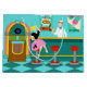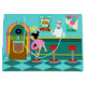 Serve up something special with this Retro Soda Fountain Gift Bag. The minimalist art, cartoon drawing design features the interior of the coolest spot in town. It's a 1950's soda fountain, in all of its kitschy glory! Against the backdrop of an aqua wall, we can see posters advertising the specialities of the house. One poster shows a hamburger and bottle of pop for the bargain price of 15 cents. The other poster shows two scoops of ice cream in a sugar cone for a mere 5 cents. With prices like these, it must be difficult to watch your waistline! A most competent soda jerk is manning the teal counter with yellow accents. The young man with the strong work ethic is holding an ice cream cone with a single scoop of lemon yellow ice cream--although, to be fair, it could be pineapple! The clean-cut lad is wearing a pristine, white shirt with a black, bow tie and a white hat with red accents. On the opposite side of the counter, we see three red and chrome bar stools. Perched on one of the stools is a blonde teenybopper whose mouth is surely watering. It's unclear if her mouth is watering over the ice cream cone that is headed her way or the industrious young man who is serving it. She is wearing a pink poodle skirt and a form fitting black top. Her yellow locks are pulled back in a classic ponytail. Next to this cutie of a customer there is a colourful, classic jukebox, which features brown, wood grain, panelling and colourful neon lights. Better than that, it is sure to feature all of the greatest rock and roll hits of the time! The floor of this mid century modern ice cream parlour is an aqua and teal, chequerboard pattern that is just screaming for someone to try all of the latest dance moves.