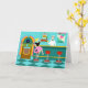 Serve up something special with this Retro Soda Fountain Greeting Card. The minimalist art, cartoon drawing design features the interior of the coolest spot in town. It's a 1950's soda fountain, in all of its kitschy glory! Against the backdrop of an aqua wall, we can see posters advertising the specialities of the house. One poster shows a hamburger and bottle of pop for the bargain price of 15 cents. The other poster shows two scoops of ice cream in a sugar cone for a mere 5 cents. With prices like these, it must be difficult to watch your waistline! A most competent soda jerk is manning the teal counter with yellow accents. The young man with the strong work ethic is holding an ice cream cone with a single scoop of lemon yellow ice cream--although, to be fair, it could be pineapple! The clean-cut lad is wearing a pristine, white shirt with a black, bow tie and a white hat with red accents. On the opposite side of the counter, we see three red and chrome bar stools. Perched on one of the stools is a blonde teenybopper whose mouth is surely watering. It's unclear if her mouth is watering over the ice cream cone that is headed her way or the industrious young man who is serving it. She is wearing a pink poodle skirt and a form fitting black top. Her yellow locks are pulled back in a classic ponytail. Next to this cutie of a customer there is a colourful, classic jukebox, which features brown, wood grain, panelling and colourful neon lights. Better than that, it is sure to feature all of the greatest rock and roll hits of the time! The floor of this mid century modern ice cream parlour is an aqua and teal, chequerboard pattern that is just screaming for someone to try all of the latest dance moves.