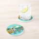 Serve up something special with this Retro Soda Fountain Sandstone Coaster. The minimalist art, cartoon drawing design features the interior of the coolest spot in town. It's a 1950's soda fountain, in all of its kitschy glory! Against the backdrop of an aqua wall, we can see posters advertising the specialities of the house. One poster shows a hamburger and bottle of pop for the bargain price of 15 cents. The other poster shows two scoops of ice cream in a sugar cone for a mere 5 cents. With prices like these, it must be difficult to watch your waistline! A most competent soda jerk is manning the teal counter with yellow accents. The young man with the strong work ethic is holding an ice cream cone with a single scoop of lemon yellow ice cream--although, to be fair, it could be pineapple! The clean-cut lad is wearing a pristine, white shirt with a black, bow tie and a white hat with red accents. On the opposite side of the counter, we see three red and chrome bar stools. Perched on one of the stools is a blonde teenybopper whose mouth is surely watering. It's unclear if her mouth is watering over the ice cream cone that is headed her way or the industrious young man who is serving it. She is wearing a pink poodle skirt and a form fitting black top. Her yellow locks are pulled back in a classic ponytail. Next to this cutie of a customer there is a colourful, classic jukebox, which features brown, wood grain, panelling and colourful neon lights. Better than that, it is sure to feature all of the greatest rock and roll hits of the time! The floor of this mid century modern ice cream parlour is an aqua and teal, chequerboard pattern that is just screaming for someone to try all of the latest dance moves.