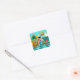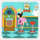 Serve up something special with these Retro Soda Fountain Stickers. The minimalist art, cartoon drawing design features the interior of the coolest spot in town. It's a 1950's soda fountain, in all of its kitschy glory! Against the backdrop of an aqua wall, we can see a poster advertising the speciality of the house. The poster shows a hamburger and bottle of pop for the bargain price of 15 cents. With prices like these, it must be difficult to watch your waistline! A most competent soda jerk is manning the teal counter with yellow accents. The young man with the strong work ethic is holding an ice cream cone with a single scoop of lemon yellow ice cream--although, to be fair, it could be pineapple! The clean-cut lad is wearing a pristine, white shirt with a black, bow tie and a white hat with red accents. On the opposite side of the counter, we see three red and chrome bar stools. Perched on one of the stools is a blonde teenybopper whose mouth is surely watering. It's unclear if her mouth is watering over the ice cream cone that is headed her way or the industrious young man who is serving it. She is wearing a pink poodle skirt and a form fitting black top. Her yellow locks are pulled back in a classic ponytail. Next to this cutie of a customer there is a colourful, classic jukebox, which features brown, wood grain, panelling and colourful neon lights. Better than that, it is sure to feature all of the greatest rock and roll hits of the time! The floor of this mid century modern ice cream parlour is an aqua and teal, chequerboard pattern that is just screaming for someone to try all of the latest dance moves.