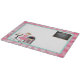 A cute cutting board with a retro soda shop theme with girl in poodle skirt, jukebox and menu board with pink sun ray border and musical notes.
