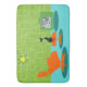 It is said that dogs have owners and cats have staff. The feline on this Retro Space Age Kitty Bath Mat couldn't agree more! The 1960's style, minimalist art design features a sleek, black cat in a mid century modern living room. The sophisticated room prominently features a green, stone wall. The carpet is aqua with teal shadows. The furnishings of the room include a yellow, sputnik light figure, an orange lounge chair with matching footstool and a green television with rabbit ears. The lucky black cat can be seen perched on the footstool in front of the television. Its favourite show is on! On the television screen, we can see a black and white, classic television family solving all of life's problems in a half hour show. This design is purrrfect, if we do say so ourselves.