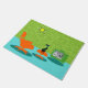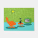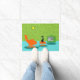 It is said that dogs have owners and cats have staff. The feline on this Retro Space Age Kitty Door Mat couldn't agree more! The 1960's style, minimalist art design features a sleek, black cat in a mid century modern living room. The sophisticated room prominently features a green, stone wall. The carpet is aqua with teal shadows. The furnishings of the room include a yellow, sputnik light figure, an orange lounge chair with matching footstool and a green television with rabbit ears. The lucky black cat can be seen perched on the footstool in front of the television. Its favourite show is on! On the television screen, we can see a black and white, classic television family solving all of life's problems in a half hour show. This design is purrrfect, if we do say so ourselves.