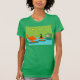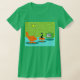 It is said that dogs have owners and cats have staff. The feline on this Retro Space Age Kitty T-Shirt couldn't agree more! The 1960's style, minimalist art design features a sleek, black cat in a mid century modern living room. The sophisticated room prominently features a green, stone wall. The carpet is aqua with teal shadows. The furnishings of the room include a yellow, sputnik light figure, an orange lounge chair with matching footstool and a green television with rabbit ears. The lucky black cat can be seen perched on the footstool in front of the television. Its favourite show is on! On the television screen, we can see a black and white, classic television family solving all of life's problems in a half hour show. This design is purrrfect, if we do say so ourselves.