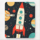 A vibrant retro-themed illustration of a classic rocket ship blasting off into space, surrounded by colourful planets, stars, and cosmic elements. the design uses bold reds, teals, and oranges against a dark starry background, evoking mid-century sci-fi aesthetics. This whimsical and nostalgic artwork is ideal for childrens. The best part of this mousepad is that you can customise it with your kid's name.