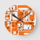 This clock is covered with mid-century modern squares of orange and black starbursts. Fun for any room.