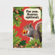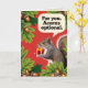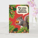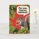 A red squirrel holds onto a small gift parcel, surrounded by oak leaves and acorns on a bright red background.