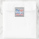 Classic square sticker design features state of Oregon silhouette with patriotic stars and stripes fill on grey Kraft paper background, and retro style text.