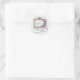 A sticker featuring a light green background with small light green polka dots. Retro inspired pink TV set features a test screen and rabbit ear antennae. Text on TV reads "Stay Tuned For An Important Message From." Personalise with your name under white section below TV set. Look for matching items at Jill's Paperie.
