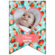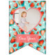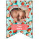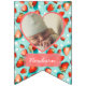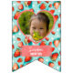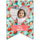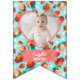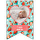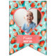 Looking for berry first birthday decor? Look at our Retro Floral Strawberry Berry First Birthday 12 Photo Bunting Flags! It features a blue-teal background adorned with vibrant strawberries and white flowers, creating a fun retro vibe for your celebration. Perfect for a strawberry themed 1st birthday party, setting the tone for a joyful and colourful day. Beautiful strawberry theme birthday decorations! You can add 12 images!