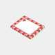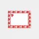 Stickies with a background pattern of red strawberries, a red frame and a trio of strawberries in the corner.