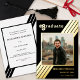 Celebrate your son’s high school, college, or university graduation in style with this bold and stylish retro photo announcement card. Featuring a bold and striking combination of modern black and gold foil stripes, this card exudes sophistication and excitement for his big achievement. The front showcases a photo template with a gold foil frame and three eye-catching gold foil stripes, while the back highlights graduation details in sleek, modern black groovy typography with a matching black frame and stripes for a cohesive look. Designed by artist Catherine Sweetman, this grad announcement card is the perfect way to share his special moment with friends and family. The easy-to-use photo template allows you to personalise it effortlessly, making it an unforgettable keepsake for this milestone occasion.