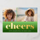 Front - Shades of Olive green and Christmas Green in a retro stripe pattern. A retro modern look for a holiday photo card with a funky and different design with the word "cheers" in foil. Add 2 photos and family signature to this fun and vibrant design.