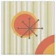 A mid century modern styled abstract art design, with beige stripes, bold orange and teal shapes, as well as sputnik starbursts.