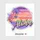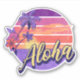 Grunge retro summer illustration with "Aloha" text design and palm tree, tropical flowers, sun, sea and rainbow decoration for summer lovers