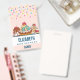 Name badge with a row of delicious looking cupcakes with swirls and cherries and yummy frosting. Illustrated in a classic retro style. Colours include retro green, red, blue and cream. Colourful confetti image sprinkled across the top.