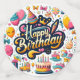 Dive into a burst of colour and fun with this energetic "Happy Birthday" design! Featuring bold typography surrounded by an exciting array of party elements including balloons, cakes, gifts, cupcakes, party hats, and fireworks, all in a lively retro-inspired art style. Perfect for invitations, party supplies, cards, stickers and gifts that truly pop and spread birthday cheer!