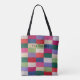 This colourful patchwork tote bag has a fun retro appearance. The knitted patchwork image on the bag is taken from a photograph of an original hand knitted pattern. The black andwhite patchwork has been photographed to show it looking natural and "pre loved" you may even see a few pet hairs! and there will be bobbly bits, stray threads and creases, this all makes up the natural look of a much loved traditional piece of patchwork knitting. The shabby chic look gives it a pre-loved feel.