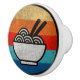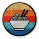 Retro style ramen illustration with noodles and chopsticks on a colourful retro style sunset background in yellow, orange, red, turquoise and blue colours