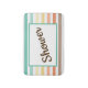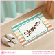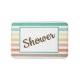 Step out of the shower in style with this colorful bathmat that features a fun retro-style stripe pattern in colorful shades of aqua, yellow, peach, and tan accented with customizable text that says, "Shower." Modify the text with your own sentiment to create a one-of-a-kind gift for new homeowners, a unique accessory for your own home, or a fun addition to a dorm room shower.