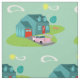 This Retro Suburban House Combed Cotton Fabric pattern features a typical American home in a typical American neighbourhood, circa 1950. A teal home with a peacock blue roof, and turquoise windows are perfectly offset by a vibrant red front door and garage door. A classic pink, 1950’s finned convertible car is parked on the picturesque driveway. Kitschy, plastic, pink flamingos look right at home on the boomerang shape of freshly mowed green grass resting on a jade background. The manicured lawn is landscaped with whimsical trees. Kidney bean shaped clouds and a yellow sunburst of a sun let you know it’s just another glorious day in mid century modern suburbia.