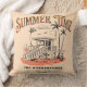 Retro Summer Time Beach Hut Illustration Throw Pillow. A vintage-style design featuring an illustration of a beach lifeguard station with a bold, retro font in orange and yellow. The background is a pale peach, complementing the minimal design. The reverse side of the pillow has a pale blue background. Personalise the throw pillow with your family name and year of establishment and you'll have a wonderful decorative piece for your beach or lake house.