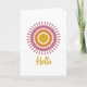 This design features a colourful Retro Sunburst in orange, purple and gold with a matching whimsical font that says: Hello. This folded note card is ideal for saying hello to friends and family or to send a short note to stay in touch. It's available as a standard 5 inch x 7 inch card or in a smaller 4 inch x 5.6 inch size and can be applied to either horizontal or vertical orientations. This design can be scaled smaller for additional customisation and personalisation. The inside of this card is left blank, so there's plenty of room to write a detailed note, or to customise it further to your needs. Sunbursts are an iconic design motif that conveys positive energy and a feeling of renewal. This sunburst design is also available in additional colour variations and additional products, please visit our store to see additional details. Optional white envelopes are also available.