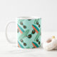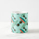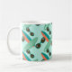 The pattern decorating this mug is inspired by summertime at the beach. It features retro style sunglasses and surfboards in cool colours of teal and green with orange.