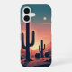 A warm retro artwork featuring tall cacti glowing under a pink sunset, designed with nostalgic tones and a textured vintage style.