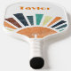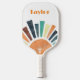 This modern pickleball paddle design features a retro sunshine design in orange, green, brown, yellow and blue on a white background, with your name in orange at the top and your monogram in bold white text for a look that is simple and stylish, yet professional.