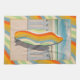 Bring a beachy vibe to your kitchen with this retro surfboard pelican wavy stripe art, perfect for coastal decor fans. Featuring a vintage surfboard and a pelican lounging in water under the sun, this design is framed by a retro wavy stripe border in vibrant teal, orange, and yellow hues. Ideal for adding a sunny, retro touch to your kitchen decor while celebrating seaside charm.