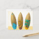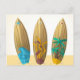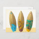 Tell your friends about your fantastic beach holiday with this surfboard postcard ! A design of three retro wooden surfboards standing together on the sand. The surfboard designs include blue waves, dolphins and palm trees. This design is cool, hip and perfect for lovers of the beach, Summer and surf lifestyle.