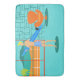 Every day can be a day at the beach with this Retro Surfer Dude Bath Mat. The 1960's style, minimalist art design features a sun-kissed, blonde, surfer dude all ready to catch a wave. Our fit surfer is gazing out on the ocean through the sliding glass doors of his beachfront home. He is standing in his aqua coloured living room. We can see an aqua and turquoise, stone wall and mid century modern, orange chair. On the opposite side of the glass door, we can see a patio. Beyond that, there is a golden, sandy beach, swaying palm tree, sparkling, peacock blue ocean, and an aqua sky. In the distance, we can see a teal volcanic island, which is dormant for the time being. Surfer Dude is holding a blue surfboard and wearing blue, tiki patterned board shorts. Catch some waves and share some love with this kitschy summer design!