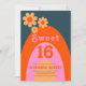 Sweet 16, celebrate her sixteenth birthday with this cool retro 60s 70s vintage colours navy blue orange pink and yellow hues rainbow arch 16th birthday party invitation. With simple daisy design and easy to use templates this custom invite sets the seen for a cool groovy hippie girls party. Original artwork by artist Catherine Sweetman