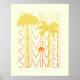 A minimalist retro-summer graphic featuring two yellow palm tree silhouettes and a striped "sunset" sun. The word "SUMMER" is repeated vertically in a thin, elegant serif font with a warm orange-to-red gradient, set against a pale cream background.