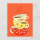A retro cute, vintage image illustration of three retro style old fashioned tea cups stacked on top of one another against a bright orange on trend background. This whimsical design is for tea and coffee lovers everywhere.