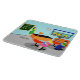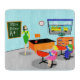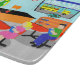 This customisable Retro Teacher Cutting Board gets an A+! This 1960's style, minimalist art, cartoon drawing features a vibrant, elementary classroom with everything needed to mould the minds of the future. It's the sort of room where ideas are valued and creativity is praised. At the front of the mid century modern classroom, we see the school's most popular teacher standing in front of a chalkboard. Teacher is wearing a bright green and yellow dress, with yellow shoes. Even though the clock on the blue wall tells us it is almost time for the final bell to ring, she still looks as fresh as a daisy. Her black hair is kept in place with a yellow headband and her mod, red glasses help her see to curtail any mischief on the back row. She is resting one hand on her orange and black desk. The clean desk is a tribute to her fine organisational skills. The only thing on the desktop is a shiny, red apple, which was undoubtedly given to her by an adoring student. Speaking of students... We can see a couple of those, as well. From our vantage point, we can see two eager students sitting behind their red, school desks. There is a blonde girl with a bouncy ponytail wearing a bright pink dress. Next to her, there is a dark haired lad wearing a green shirt and blue jeans. Each child is holding a bright blue school book. They are so eager to learn that they haven't even noticed it is almost time for them to board the yellow school bus we see waiting for them through the open blinds on the classroom window. Beneath the window, there is an orange bookshelf holding colourful books and a globe of the world. Don't worry, kids. Tomorrow, you will be back in your places with bright, shining faces. The name on the chalkboard is customisable.