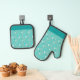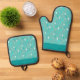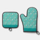An oven mitt set with a retro star pattern in teal and white on a light teal background and a dark teal border.