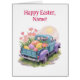 This heartwarming watercolor design features a retro two-tone pickup truck in teal blue and soft purple, driving away into a sunny spring day. The truck bed is overflowing with giant, colorful Easter eggs and blooming pink flowers, capturing the pure joy of the holiday.