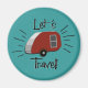 The retro design on this magnet is reminiscent of the print advertisements from the 50’s and early 60’s with a teardrop camper in vintage red and silver and the phrase “Let’s travel!” From my original digitally created image.