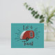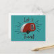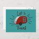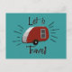 The retro design on this postcard is reminiscent of the print advertisements from the 50’s and early 60’s with a teardrop camper in vintage red and silver and the phrase “Let’s travel!” From my original digitally created image.
