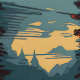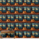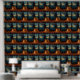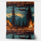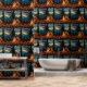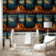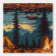 Blue, orange and brown retro tent with a burning campfire at dusk. Camping themed stick and peel wallpaper. Cute for cabin living.