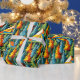 Birthday gift wrap in vintage colours green, tan and orange camping themed gift wrap with tents on a campsite and pine trees.