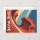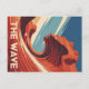 A striking retro-style poster illustrates "The Wave," a unique sandstone rock formation with swirling red and orange patterns, highlighting the natural beauty of the desert landscape under a clear blue sky.