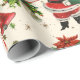 This wrapping paper features a charming retro Christmas pattern with a cream-coloured background. The design includes repeating images of a jolly Santa Claus standing next to a green mailbox, a young girl in a red and green dress ringing a bell, bright red poinsettias, and clusters of holly and bells. Small snowflakes and starbursts are scattered throughout the pattern, giving it a vintage, mid-century holiday card aesthetic.