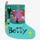 This customisable Retro Family Trimming the Christmas Tree Holiday Stocking contains every holiday tradition but the fruitcake. A 1960's cartoon family is at home in their mid century modern living room. There is a turquoise and teal brick wall and a red, cone fireplace with a roaring fire. Dad is wearing a black suit and red tie. He is hanging green Christmas stockings on the mod chimney with care. Next to dad, Junior is perched precariously on an orange chair. Whoa! Easy there, Junior! He is reaching out to put an ornament on a kitchy, pink, Christmas tree that is already decked out with teal ornaments and a yellow star. On the opposite side of the tree, Mum is holding a festively wrapped present. Hey, no shaking allowed! Mum is wearing a bright red wiggle dress with white trim. She is also wearing a Santa hat. Beneath the tree, there is a sleek black cat wearing a red bow. On the floor, there is a green and black record player surrounded by colourful vinyl albums. You just know that the family is singing along with their favourite Christmas carols while they are decking the halls. Below the design, two, yellow starbursts surround the name of the stocking owner. The opposite side of the stocking features a turquoise and teal brick pattern.