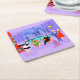 This Retro Tropical Christmas Party Paper Coaster is festive enough to brighten anyone's holiday outlook! The cartoon design features the type of wildly sophisticated holiday party that is normally only seen in Christmas movies from the 1960s. There is a mid century modern living room filled with partygoers enjoying the swanky, purple decor. A lovely woman in a French maid's uniform is carrying a tray of martinis. She is standing beside a red, cone fireplace with a roaring fire. Three green stockings are hung by the mod chimney with care. In the centre of the room, an attractive couple is lounging in orange egg chairs. The woman is wearing a festive, green dress. The man is wearing a black suit with a red tie. They are each holding a martini. Another couple is getting cosy beneath a dangling, yellow, Sputnik chandelier. The distinguished, grey haired gentleman is wearing a blue suit, light blue shirt and red tie. He is also wearing a Santa hat and holding a martini in each hand, showing the world that his partying days are far from over. His companion is a shapely blonde in a stunning red dress. Mr. Distinguished had better look out because she is holding a sprig of mistletoe in her hand. At the front of the room, there is a kitschy, pink Christmas tree, complete with teal ornaments and a yellow star. Behind this scene, we can see through floor to ceiling glass walls. The outdoor scene features a round, turquoise swimming pool. We can see the purple silhouette of a woman dipping her legs into the water. Between purple, stone walls, there are silhouettes of palm trees decorated with ornaments and Christmas lights. The silhouettes of dancing and talking partygoers are also visible. If there's one thing this proves, it's that, while people who live in glass houses shouldn't throw stones, they should definitely throw parties!
